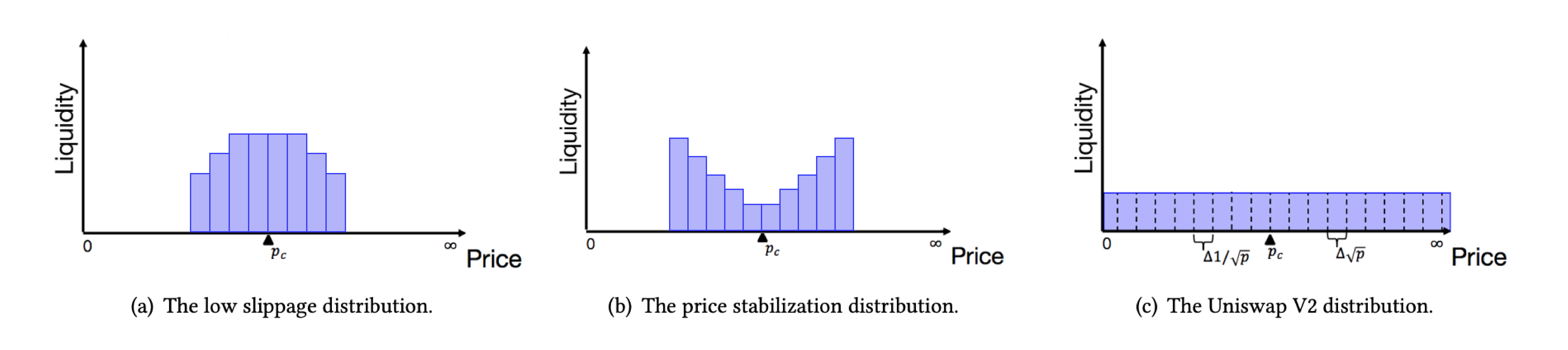 In the mechanism of V2, liquidity providers need to provide liquidity across the entire price range, which will result in low utilization of funds. For example, in practical situations, it is almost impossible for someone to sell ETH at a price of 1ETH = 1 USDC. However, in the V2 mechanism, we still need to prepare a certain amount of USDC to deal with this situation. As illustrated in the figure2 (c), liquidity is evenly distributed throughout the entire space. It is worth noting that even distribution of liquidity does not mean an equal distribution of token quantity. For more detailed information about V2, please refer to Uniswap’s official documentation.